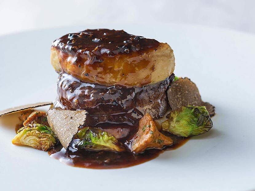 For the main dish, we offer a Christmas-worthy delicacy, combining tender Japanese Black beef with mellow-smelling foie gras and truffles. The luxurious flavor is enhanced by the Perigueux sauce, made with Madeira and fond de veau. For dessert, we offer a dish that tells the adorable story of Santa Claus and his reindeer. Enjoy it by breaking the fondant au chocolat chimney and pouring out the chocolate sauce.