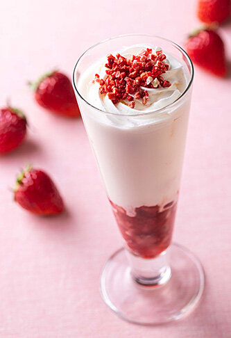 A refreshingly sweet drink made with strawberry pulp, milk, whipped cream, and freeze-dried strawberries. You can enjoy different flavors and textures by mixing them together.